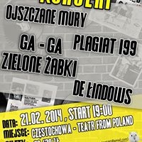 21.02.14 - Ga-Ga Zielone Żabki, Plagiat199, De Łindows, Ojszczane Mury, Teatr from Poland, Al. NMP 2, godz. 19.00, wstęp 20/30 zł. Przedsprzedaż: TFP, Al. NMP 2, Salon Muzyczny Rock'n'Roll, Al. Kościuszki 14 A (rezerwacja w cenie przedsprzedaży na maila gagazz.kontakt@gmail.com - w tytule rezerwacja i miasto, w treści ilość biletów i nazwisko).